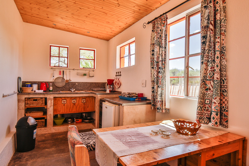 The self-catering house has two cosy rooms with a total of five beds, two bathrooms and a separate kitchen. In front of the house is a large shaded veranda with its own barbecue area and views of the Tsondab Rivier and the Naukluft mountains. These rooms can also be booked with board.